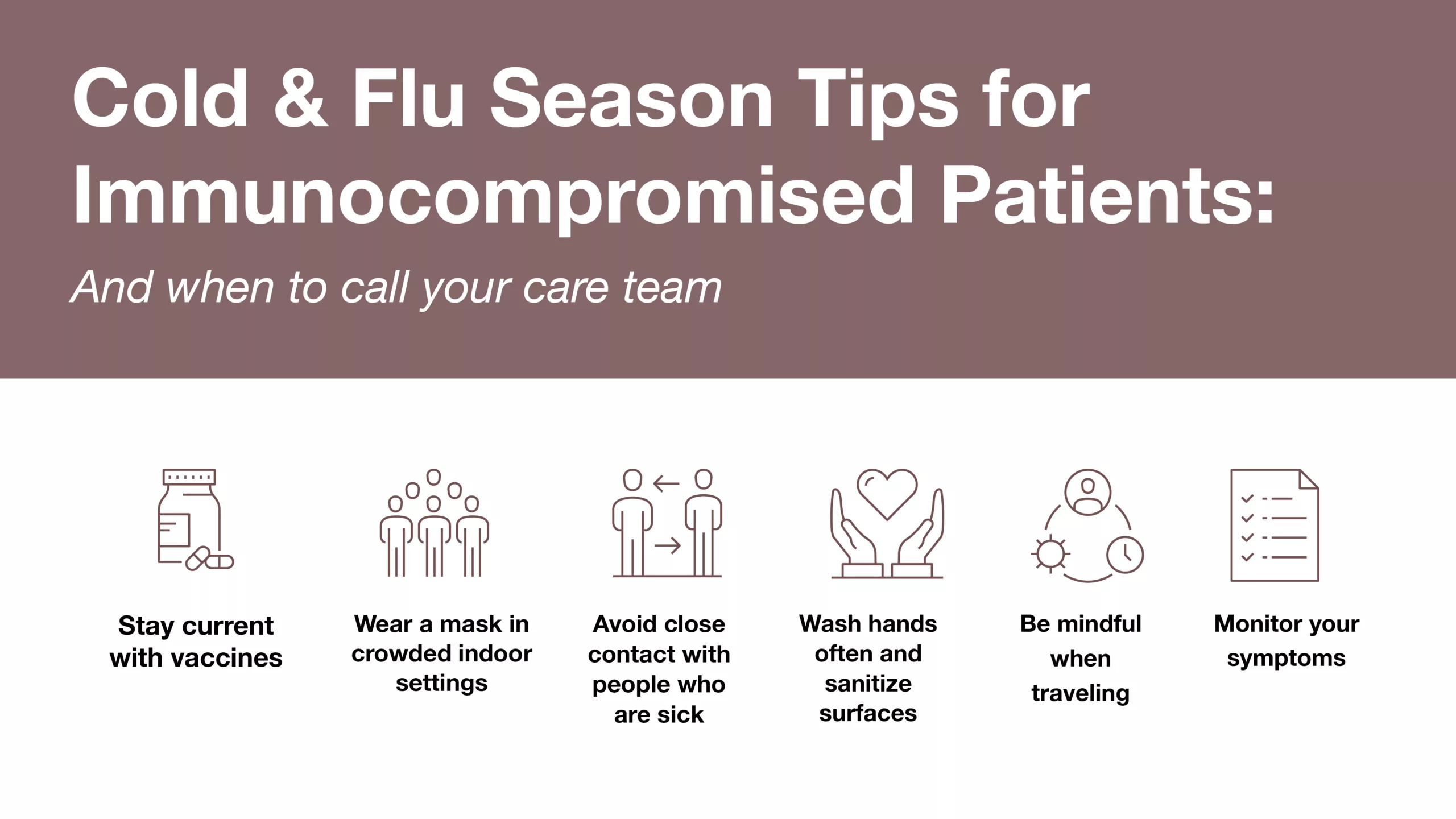 Cold and flu season can be especially risky for patients with weakened immune systems, including those undergoing cancer treatment. With increased time indoors and more circulating viruses, it’s important to take extra precautions to stay healthy and know when to reach out for support.